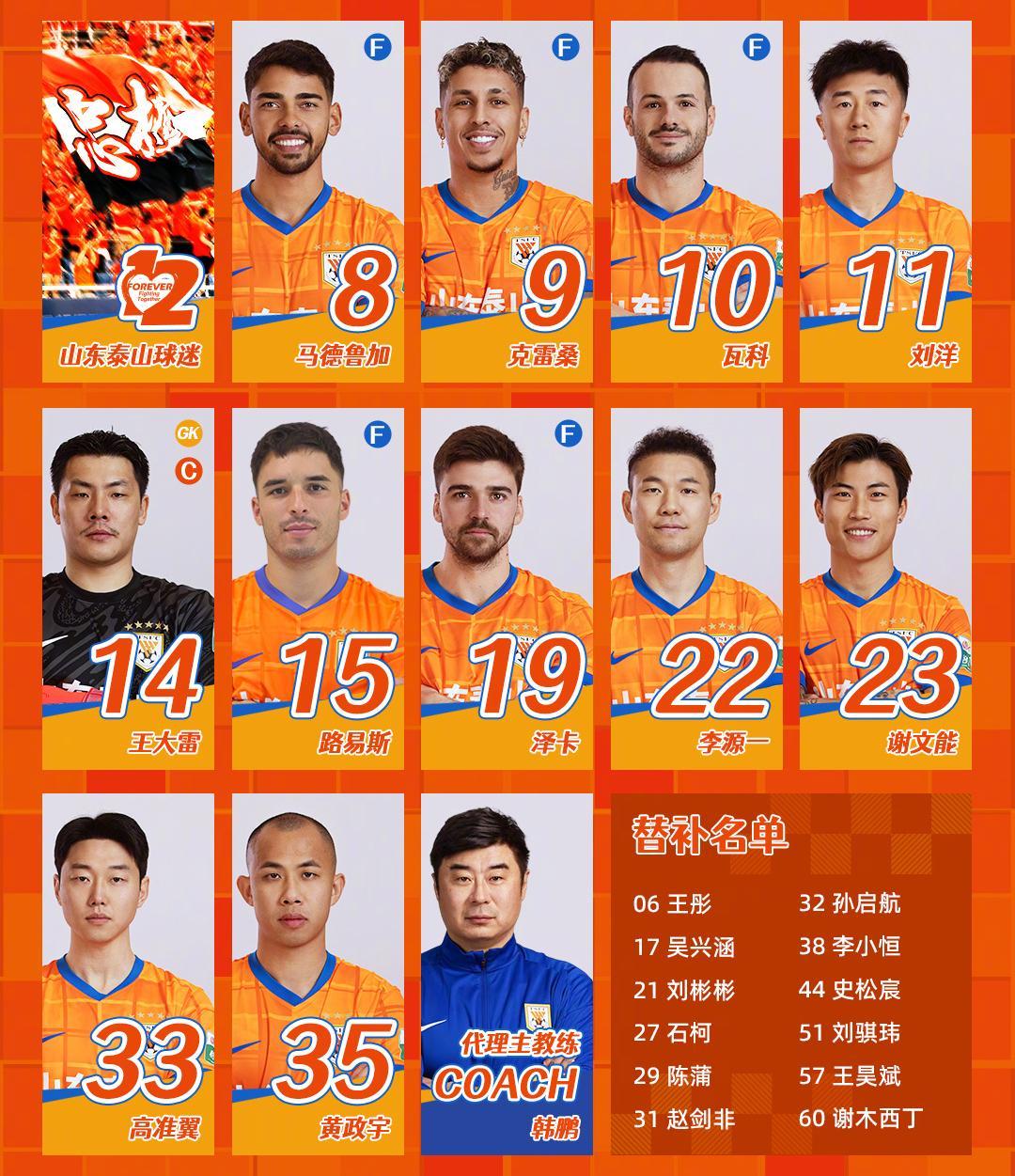 锋线上,泽卡因伤休战多场后终于复出,本场他将与克雷桑形成进攻搭档。这也是泰山队近期首次迎来5名外援齐整的局面。近期连续获得首发机会的李小恒回到替补席。考虑到泽卡伤愈复出的体能储备问题,他有希望在下半场替补登场。